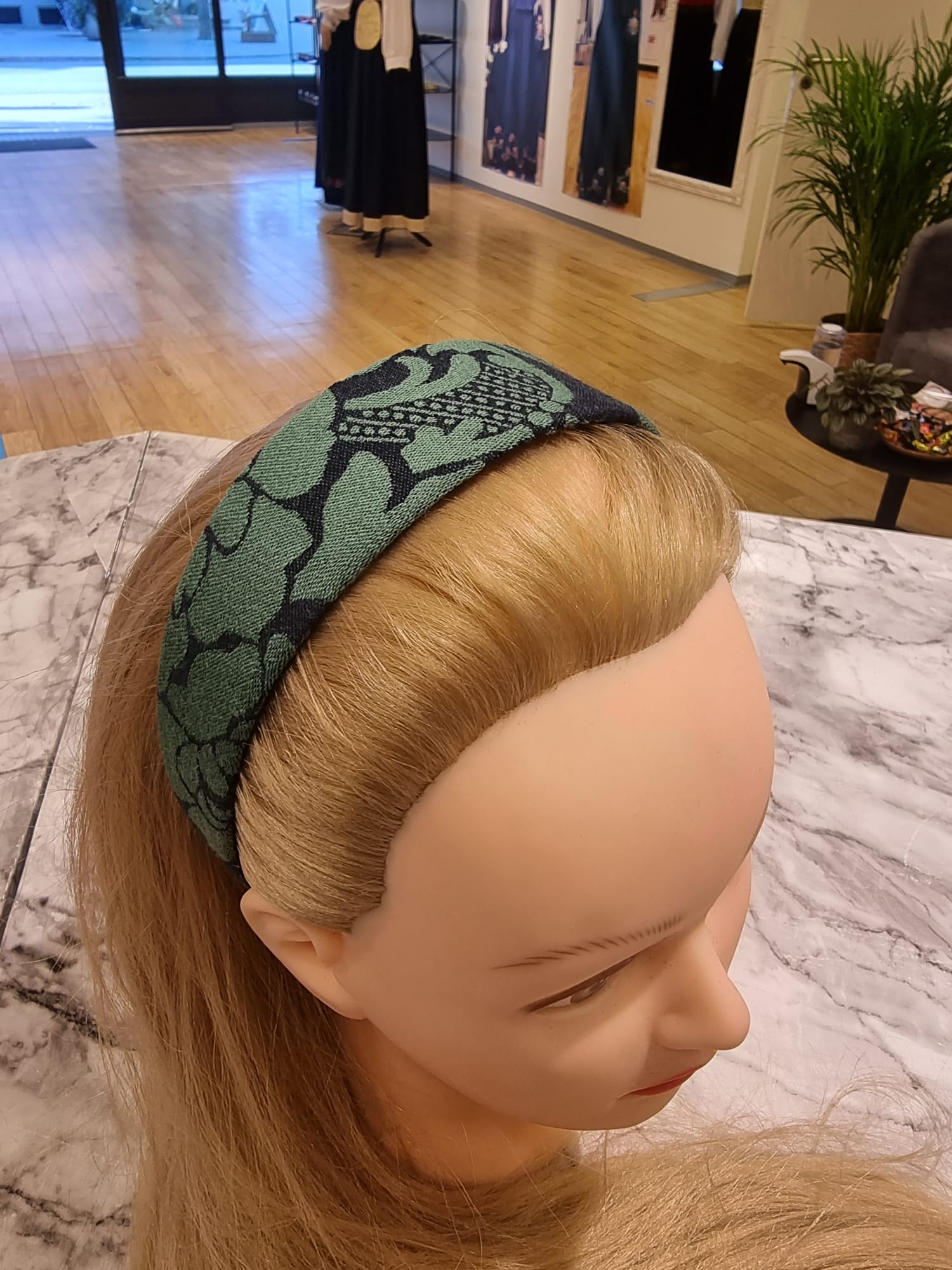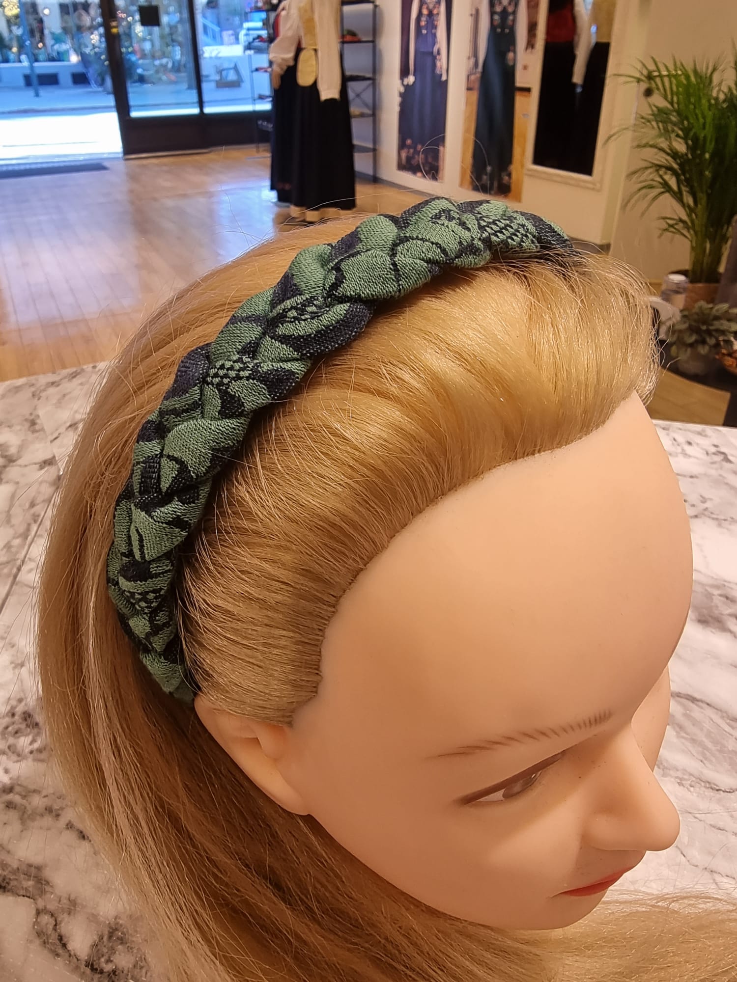Hårbøyle til Nordmørsbunad laget av samme stoff som grønn vest damask.
